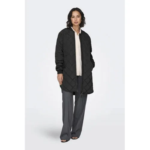 Deze ONLY jas heeft een ronde hals en lange mouwen. De jas heeft een ritssluiting. De jas is geschikt voor herfst en winter, heeft zijzakken en valt onder de quilted jassen.