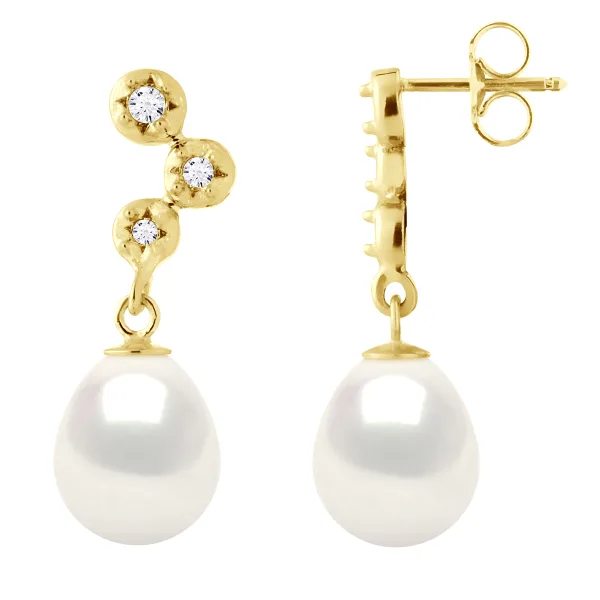 Oorbellen PRESTIGE - Diamanten 0,12 Cts ( 2 x (1 x 0,03 + 1 x 0,02 + 1 x 0,01) Cts - Kwaliteit HSI ) - Geel Goud - Echte Gecultiveerde Zoetwaterparels Pear 9-10 mm - Vlinder Sluiting - Geleverd met Certificaat van Authenticiteit en Internationale Garantie - GEMAAKT IN FRANKRIJK -