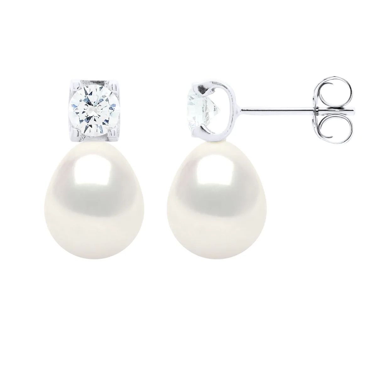 Oorbellen 'Solitaire' Cubic Zirconia Diameter 4,50 mm - Echte GeCultiveerde Zoetwaterparel Peervorm 9-10 mm - KLEUR NATUURLIJK WIT - Zilver 925 Rhodium vermeerd - Vlindersluiting - Geleverd met Certificaat van Echtheid en Internationale Garantie - GEFABRICEERD IN ONZE FRANSE WERKPLAATSEN