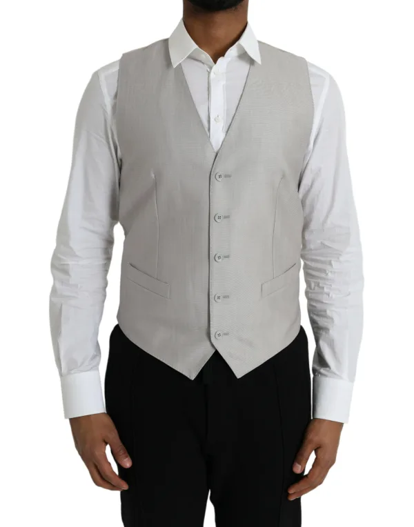 Verhoog je stijl, trek de aandacht en straal vertrouwen uit. Dit Dolce & Gabbana gilet biedt ongeëvenaarde verfijning voor je formele garderobe. De premium wolmix zorgt voor een zachte feel en een elegante val. Ervaar een op maat gemaakte pasvorm die je silhouet accentueert, perfect voor zakelijke vergaderingen, bruiloften of speciale evenementen. De veelzijdige lichtgrijze tint coördineert moeiteloos met verschillende pakken en overhemden. Geniet van het klassieke V-halsontwerp en functionele zakken. Een tijdloos stuk dat blijvende stijl en kwaliteit biedt. Alleen stoomreinigen.