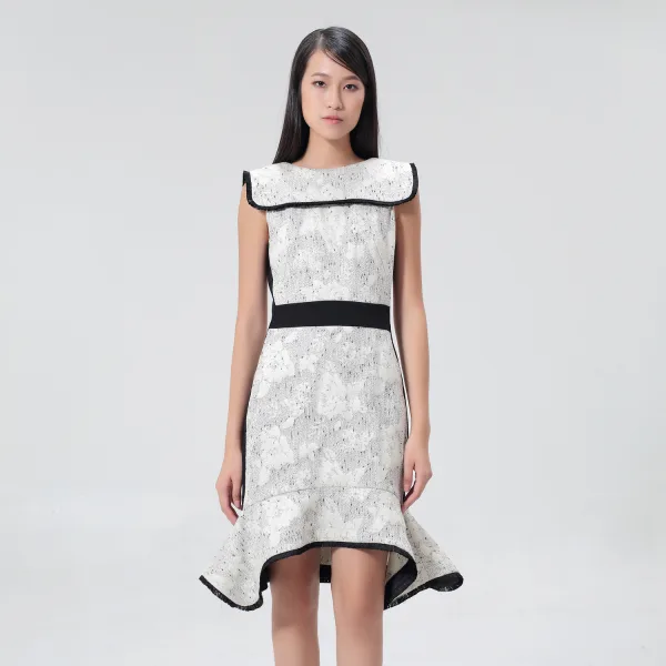 Een statement -stuk met verfijnde details: deze jurk is gestructureerd door een contrasterende stof op taille en langs de zijkanten. Wijd storm klapt langs de schouders voor en achter en een ruche die aan de zijkanten van de rok stort. De randen zijn verfraaid met een contrasterende randafsnede en het hele stuk is gesneden in een jacquard stof gespikkeld met tone-op-tone patroon. Productdetails: • Formulier: Cut-to-Fit • Lengte: 92 cm • Ronde halslijn • Zonder mouwen • Invisible Zipper Center Back