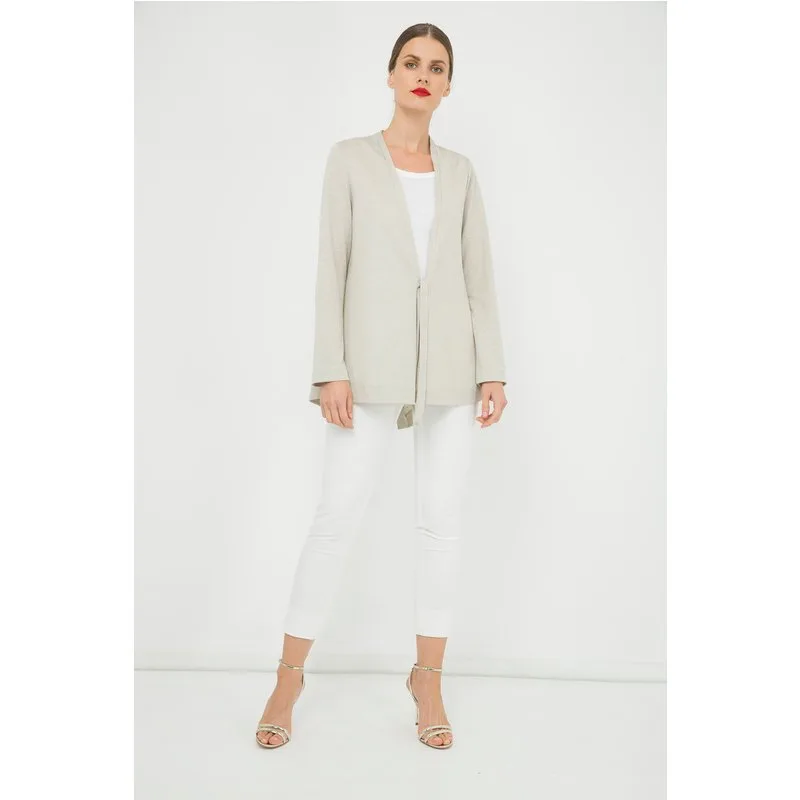 Gebreid vest met lange mouwen in stretchstof, 100% linnen. Opengewerkt met een bandje aan de voorkant van het kledingstuk. Ons model heeft een lengte van 178 cm en draagt maat 36. Afmetingen voor maat 38 (in cm):Borst-49; Lichaamslengte-73; Taille-56; Schouderbreedte-37; Zoomlijn-73, mouwlengte-60. Kledingstuk is loose fit.