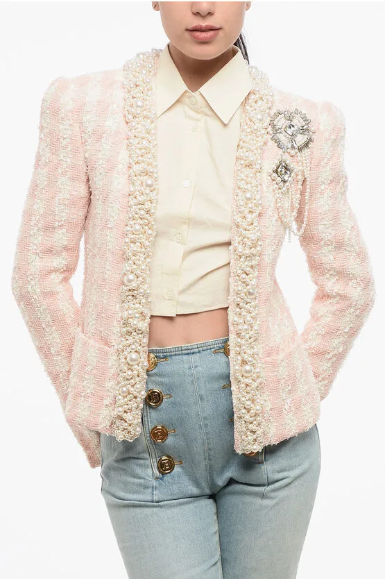 Open Tweed Blazer versierd met decoratieve kralen in roze Prijzen