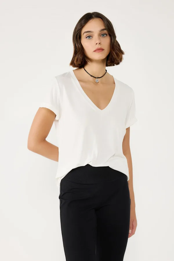 Design: Gevoerde zoom/rand; Materiaal: Jersey; Halstype: V-hals; Motief: Effen; Extra's: Op staal naden, Voelt zacht aan; Pasvorm: Normale pasvorm; Armlengte: Kwartmouw; Lengte: Normale lengte