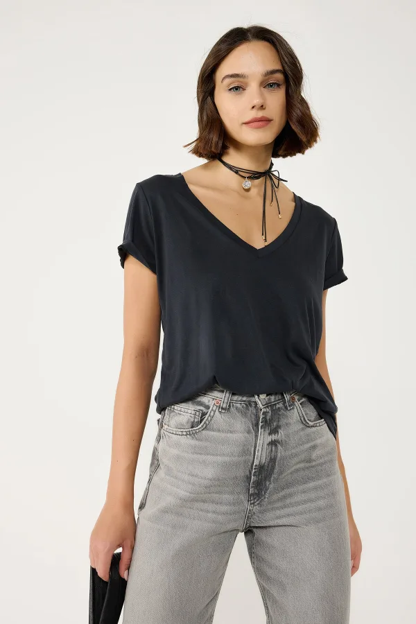 Design: Gevoerde zoom/rand, Rechte zoom; Materiaal: Jersey; Halstype: V-hals; Motief: Effen; Extra's: Op staal naden, Voelt zacht aan; Pasvorm: Normale pasvorm; Armlengte: Kwartmouw; Lengte: Normale lengte