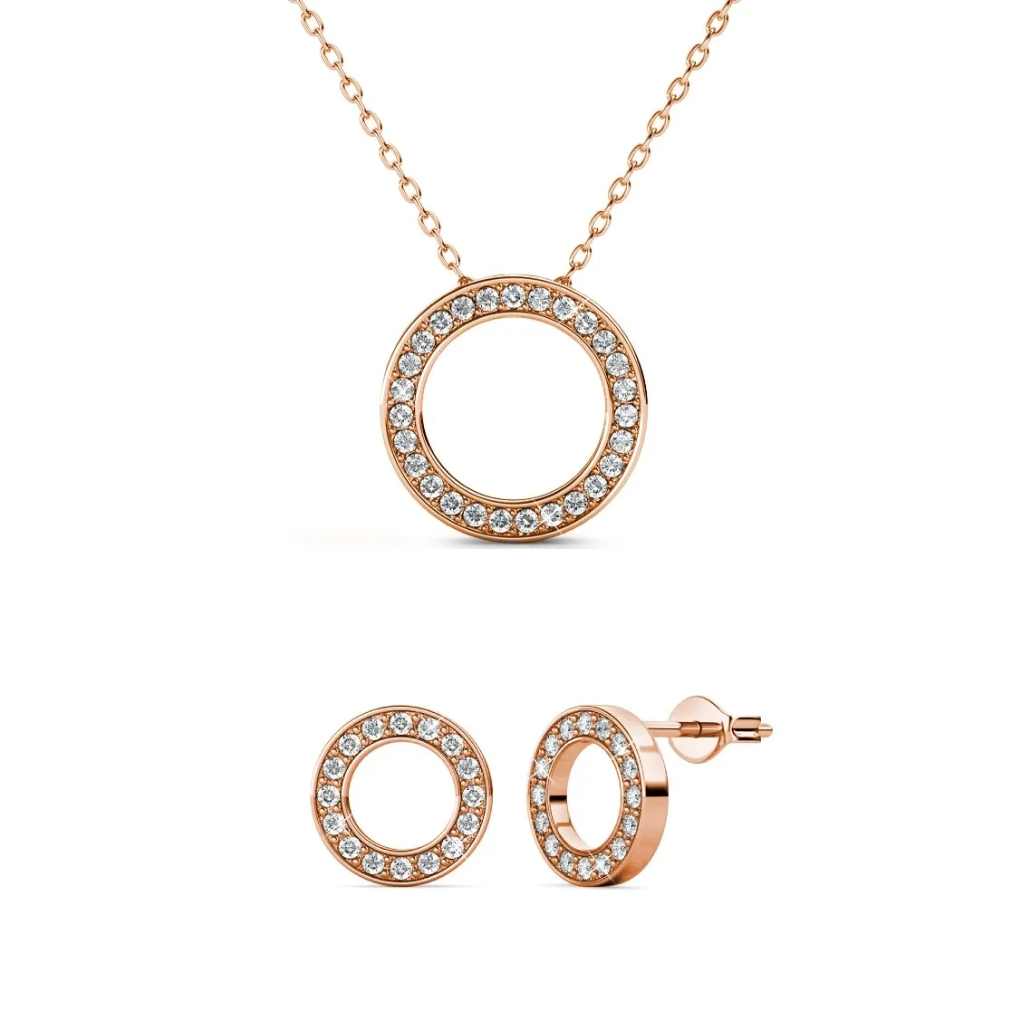 Samenstelling: Messing Afwerking: 18k verguld met roségoud Steensoort: Witte zirkoon Aantal stenen (stuks): 59 Steenkleur: Kristal Diameter oorbellen (mm): 8,4 Lengte ketting (mm): 400 + 50