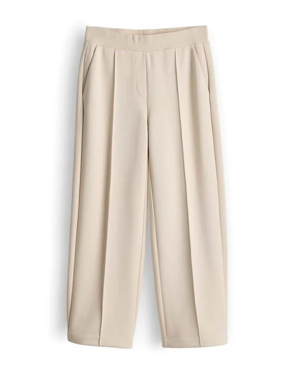 Broek Maikito van Opus is een halfhoge joggingbroek met normale taille, aanschuifsluiting en wijde pijpen. De effen, lichtbeige stof heeft persvouwen, schuine steekzakken en een elastische ribboord in de taille. Netjes te combineren voor werk of diner, met comfortabele bewegingsruimte.