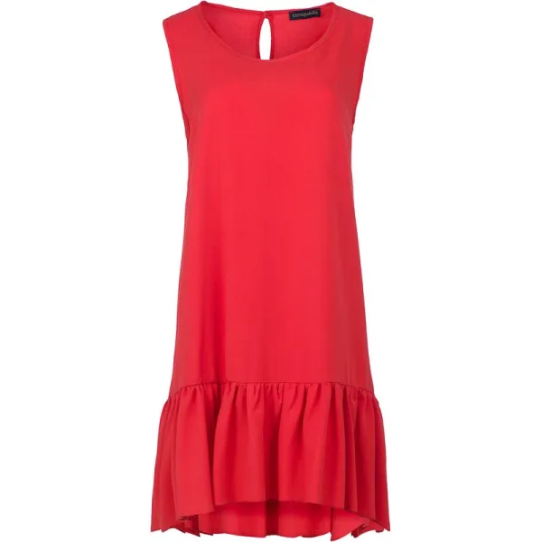 Deze oranje jurk is gemaakt van geweven tencelstof. Het is mouwloos met een ronde halslijn en sluit op de rug met een sierknoop. De armsgaten en halslijn zijn afgezet met dezelfde stof. De jurk heeft een franje van 21 cm aan de zoom en is aan de voorkant 10 cm korter dan aan de achterkant. Het A-lijn silhouet heeft een losse pasvorm.