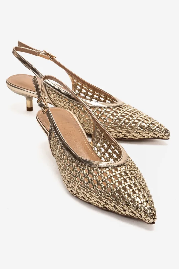 Een glinsterende geweven kitten-heel pump die subtiele glitter combineert met een vrouwelijk spitse neus