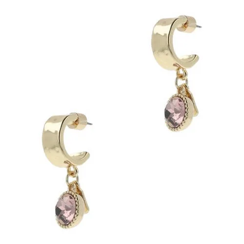 Deze elegante oorbellen combineren de look van een klassieke creool met de schittering van een edelsteen. De goudkleurige halfronde ringetjes dragen een verfijnde hanger met een schitterend roze kristal in een gekartelde zetting