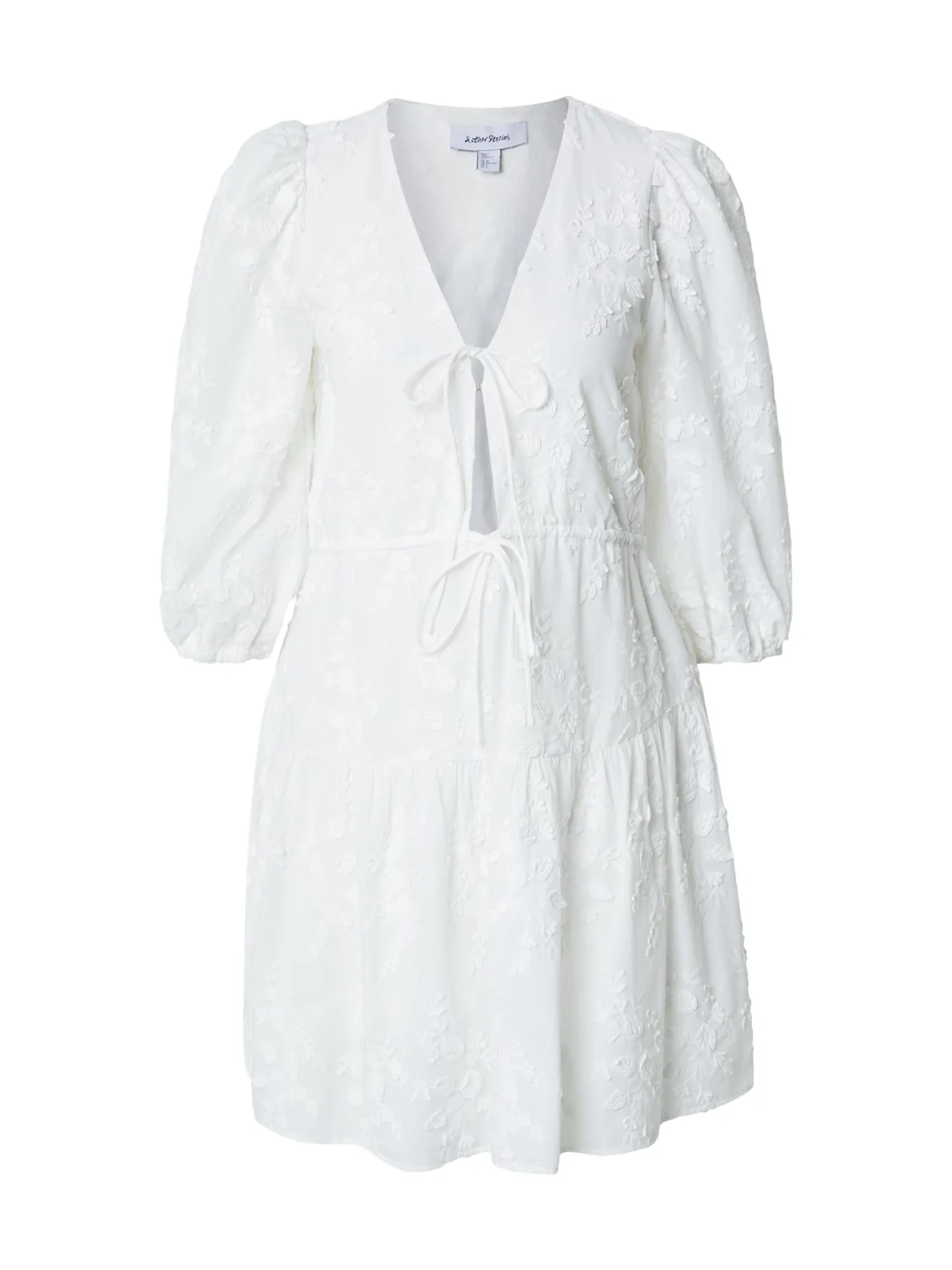 Design: Gevoerde zoom/rand, Pofmouwen, Om te knopen/binden; Materiaal: Katoen; Halstype: V-hals; Motief: Effen; Details: Cut-outs, Borduursels, Volant, Gedrapeerd; Extra's: Lichte stof, Met textuur; Lengte: Kort/mini; Snit: Getailleerd; Pasvorm: Losse pasvorm; Armlengte: Driekwart mouw