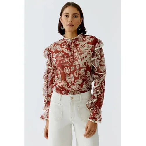 Breng kleur in je garderobe met deze dames top met lange mouw van OUI in rood met ecru. De blad- en bloemenprint geeft een frisse, lichte uitstraling, ideaal voor het voorjaar. De soepele stof valt mooi om het lichaam en beweegt gemakkelijk met je mee, zodat je je de hele dag vrij kunt bewegen.Verfijnde details die opvallen Mao kraag voor een moderne, nette halslijn die niet te strak sluit Ruches langs de kraag en schouderpartij voor een vrouwelijk accent Rechte mouwen voor een relaxed silhouet en comfortabel draaggevoel Blad- en bloemenprint in rood / ecru die direct sfeer geeft aan je outfit Glad, zacht aanvoelend materiaal dat gemakkelijk over de huid glijdt Geen zakken voor een rustige, elegante voorkantVeelzijdig in het dagelijks dragenDeze top past goed bij een nette broek voor op kantoor, maar ook bij een denim jeans voor een meer casual dag. De lange mouwen maken het een fijne keuze voor frisse lentedagen, terwijl de lichte stof prettig blijft aanvoelen als het wat warmer wordt.OUI: stijl met aandacht voor detailOUI staat bekend om eigentijdse mode met zorgvuldig uitgewerkte details en mooie prints. De collecties zijn ontworpen met aandacht voor pasvorm en draaggemak, zodat je er niet alleen verzorgd uitziet, maar je ook prettig voelt in wat je draagt.Een sfeervolle top die je garderobe klaar maakt voor het voorjaar.