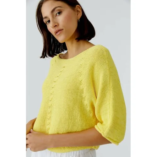 Breng kleur in je garderobe met deze gele dames top met halve mouw van OUI. De frisse gele tint geeft direct een zonnige uitstraling, terwijl de effen kleur het item makkelijk combineerbaar maakt met je favoriete jeans, pantalon of rok. De boothals en rechte mouwen zorgen voor een moderne, vrouwelijke look die zowel casual als wat netter gedragen kan worden.Details die het verschil maken Halflange, rechte mouwen voor een luchtig en toch aangekleed silhouet Boothals die mooi langs de halslijn valt Effen gele kleur die je outfit direct opfrist Gemaakt van katoen met een soepele touch voor een prettig draaggevoel Onderdeel van de Boutique collectie, voor een verzorgde, modische stijl Geschikt voor het lente seizoen, maar ook goed te dragen in laagjesVeelzijdig in het dagelijks levenDeze top past gemakkelijk in je dagelijkse routine. Combineer met een lichte jeans voor een ontspannen weekendlook of draag met een nette broek voor een dag op kantoor. Door de halflange mouw voelt het comfortabel aan op mildere dagen en schuif je er op koelere momenten eenvoudig een vest of blazer overheen.OUI met aandacht voor stijlOUI staat bekend om mode die eigentijds en verzorgd oogt, met aandacht voor mooie pasvormen en doordachte details. Elke collectie is ontworpen om goed te combineren, zodat je met een paar sterke basisstukken verschillende outfits kunt samenstellen.Een zonnige basic die je garderobe op een subtiele manier vernieuwt.