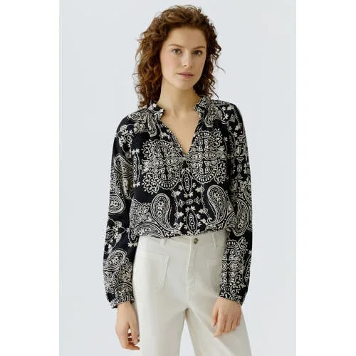 Geef je dagelijkse look een speelse update met deze OUI viscose dames top met lange mouwen. De all over print zorgt voor een opvallend geheel, terwijl de vrouwelijke V-hals en knoopsluiting het model een rustige balans geven. Gemaakt van 90% viscose en 10% polyamide voelt de stof soepel aan en valt de top mooi langs het lichaam.Details die het verschil maken Lange mouwen met rechte mouwinzet voor een ontspannen, nette uitstraling V-hals met knoopsluiting waardoor je zelf bepaalt hoe open je de hals draagt All over print voor een levendig effect dat je outfit direct karakter geeft Gemaakt van 90% viscose en 10% polyamide voor een zachte, gladde stof met prettig draagcomfort Ontwerp zonder zakken voor een rustig en clean frontVeelzijdig te combineren in je dagelijkse outfitsDeze top past gemakkelijk in verschillende outfits. Combineer met een jeans voor een casual dag, of draag de top op een nette broek of rok voor een meer geklede look. Door de lange mouwen is dit een fijne optie voor het tussenseizoen of voor lagen onder een vest of blazer.OUI, mode met aandacht voor detailOUI staat bekend om eigentijdse collecties met doordachte details en fijne materialen. Het merk richt zich op draagbare mode die je moeiteloos mixt en matcht, zodat je met een paar keuzes steeds weer nieuwe combinaties kunt maken. Met deze top haal je een veelzijdig kledingstuk in huis dat past bij een moderne, verzorgde stijl.Een comfortabele, opvallende basis voor outfits waarin jij je elke dag verzorgd voelt.