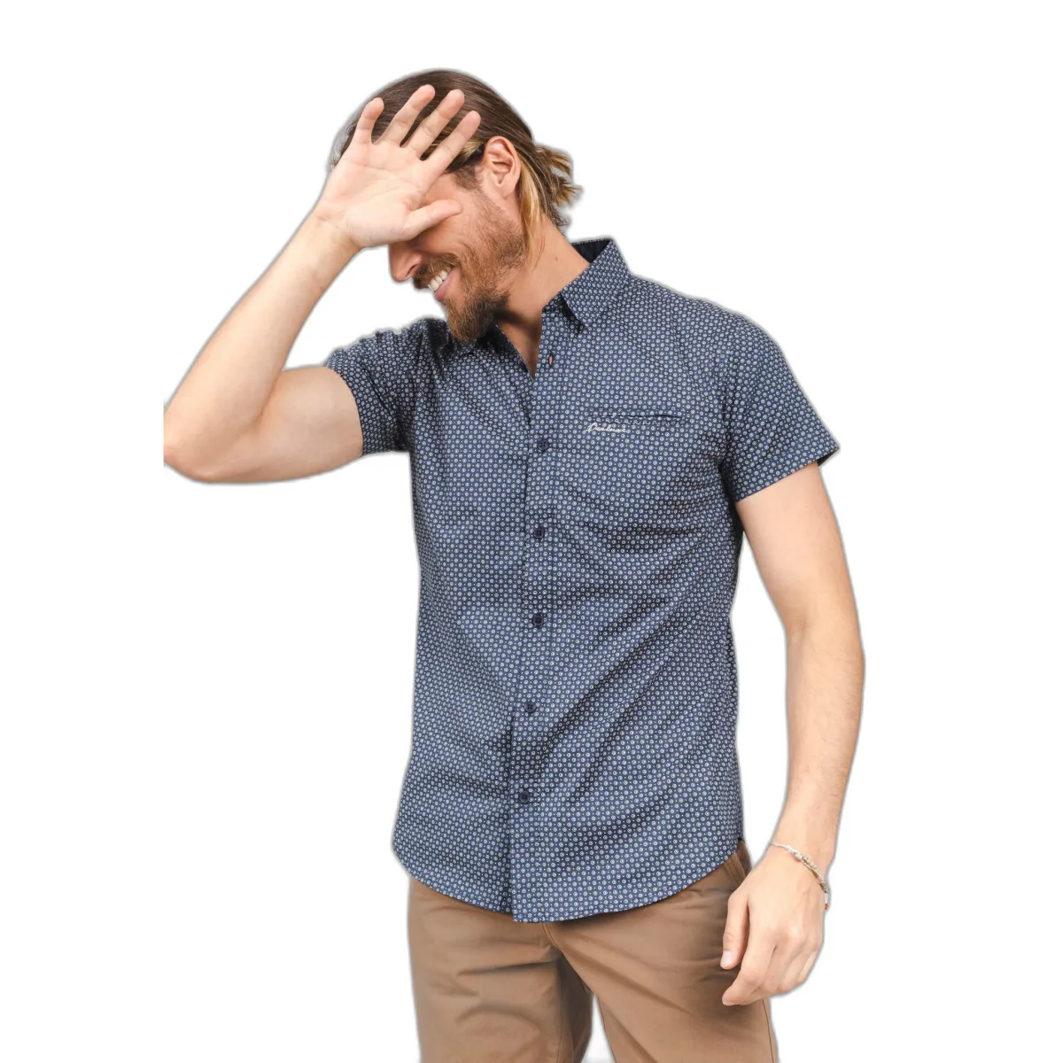 Het overhemd met patroon is onmisbaar voor het lente-zomerseizoen. Ontdek ons herenoverhemd met korte mouwen FLOWLY, te dragen met een blauwe jeans of een chino-broek voor nog meer chic.