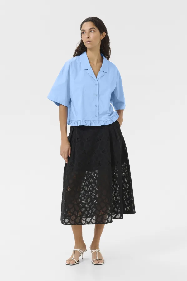 Deze cropped blouse heeft een ontspannen pasvorm, een klassieke kraag, knoopsluiting en korte mouwen. De subtiele rucherand voegt een mooie touch toe en maakt het item perfect voor zowel dagelijks gebruik als feestelijke gelegenheden. Wassen op 30°, niet bleken, niet in de droger drogen, Druipnat ophangen, koud strijken max. 110° C,. 100% Katoen