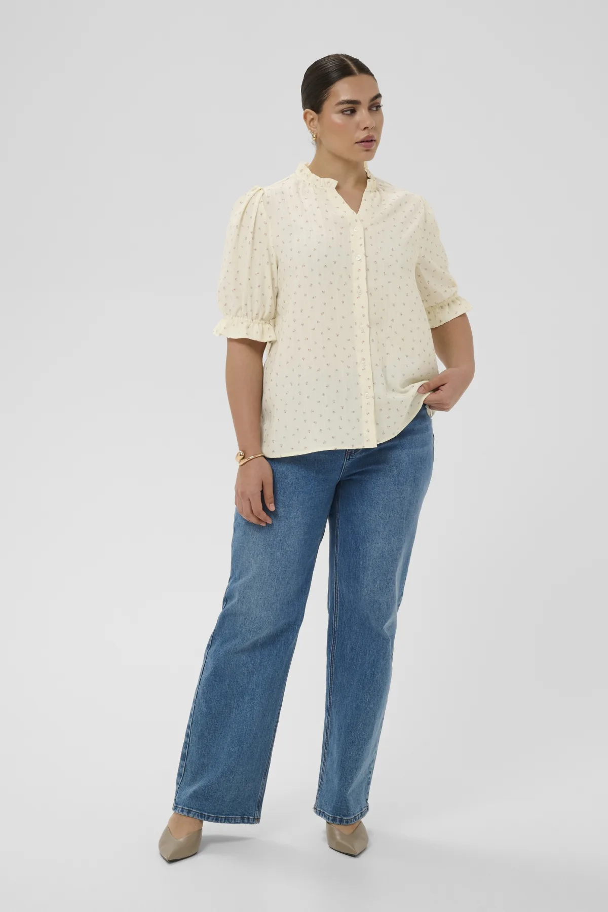 Deze blouse heeft een rechte pasvorm met een subtiele gerimpelde opstaande kraag en V-hals. De halflange mouwen zijn voorzien van een fijne ruffle aan de boord, wat zorgt voor een licht volumineus effect. De blouse sluit aan de voorkant met knopen en heeft een licht gestructureerd oppervlak.