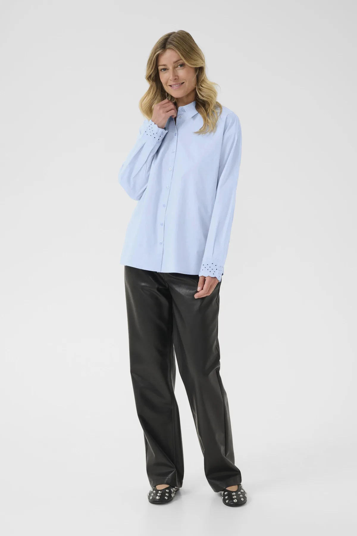 Deze damesblouse heeft een comfortabele, rechte pasvorm, een klassieke kraag en knoopsluiting. Opvallende manchetdetails maken het geschikt voor zowel zakelijk als casual gebruik. Fijne was 30°, niet bleken, niet in de droger drogen, Druipnat ophangen in de schaduw, koud strijken max. 110° C, 100% Katoen