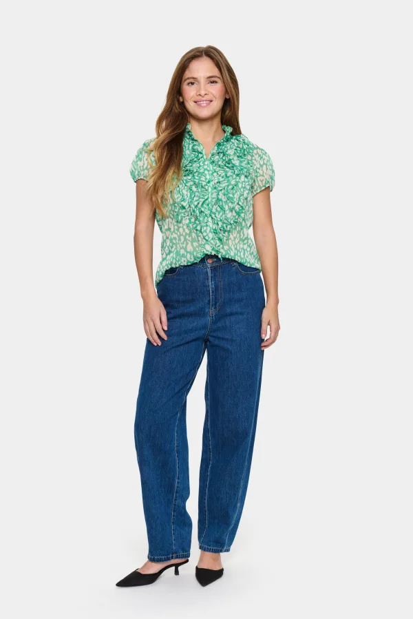 Korte mouwen shirt met hoge hals, ruchesdetails op de borst en naar beneden, en een knoopsluiting.