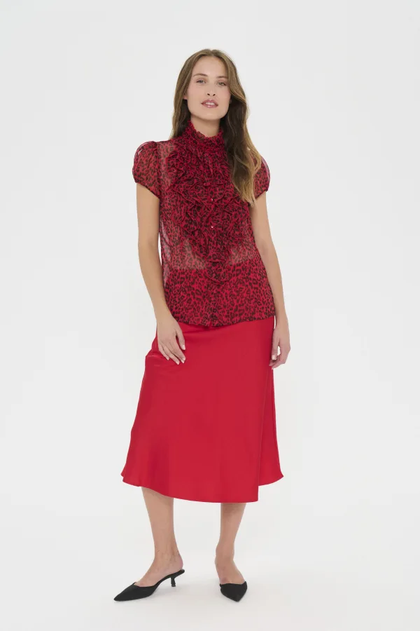 Korte mouwen shirt met hoge hals, ruchesdetails op de borst en naar beneden, en een knoopsluiting.