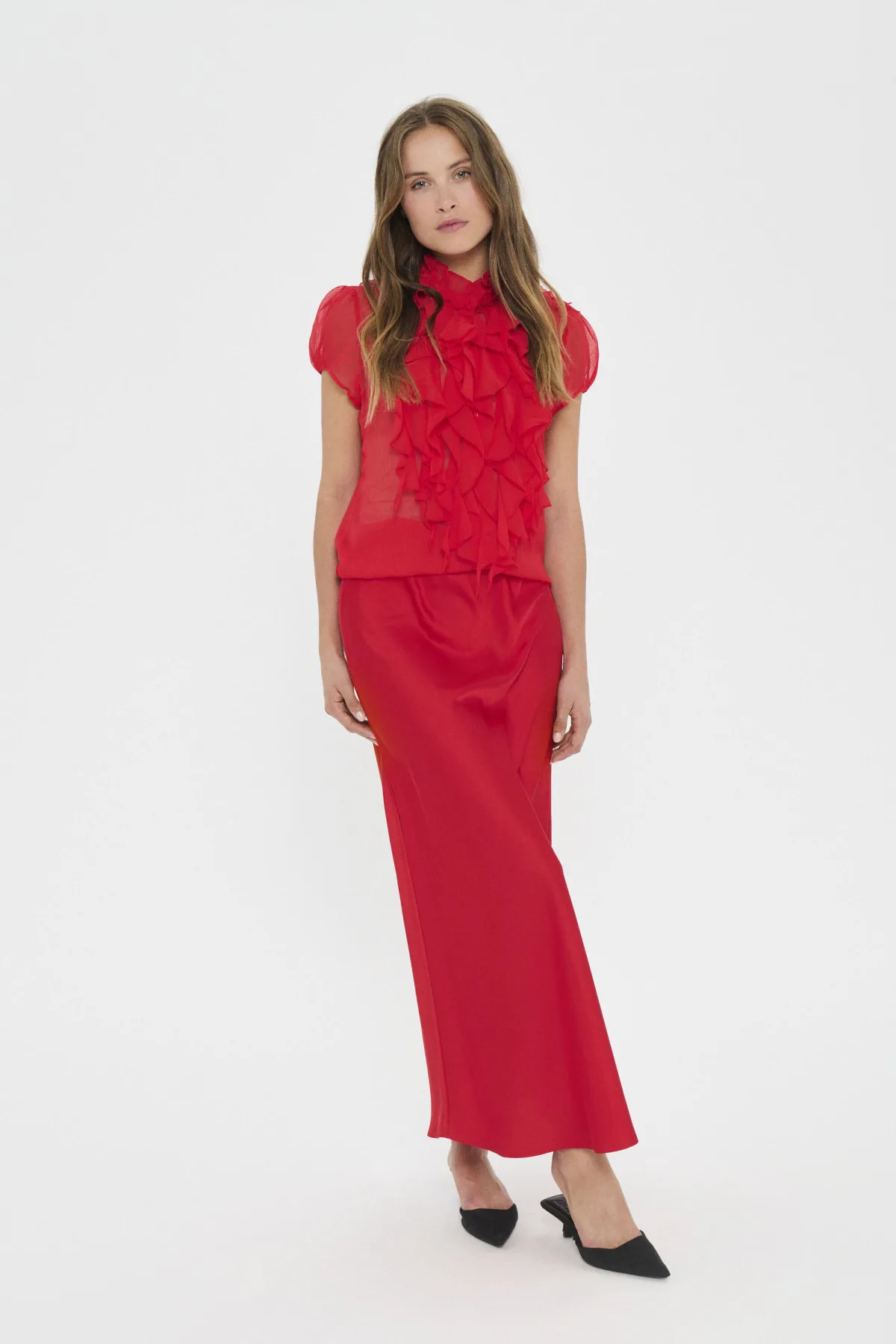Korte mouwen shirt met hoge hals, ruchesdetails op de borst en naar beneden, en een knoopsluiting.