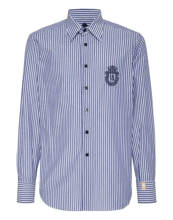 Verander je elegantie voor speciale gelegenheden met dit gestreepte overhemd van fijn katoen met garen. Zie de verzorging voor details. Gestreept katoen popeline Geborduurd schild op linkerborst Knoopsluiting met logo Kraag: Milano Getailleerde rug Afgeronde zoom Pasvorm: Zilver Slank