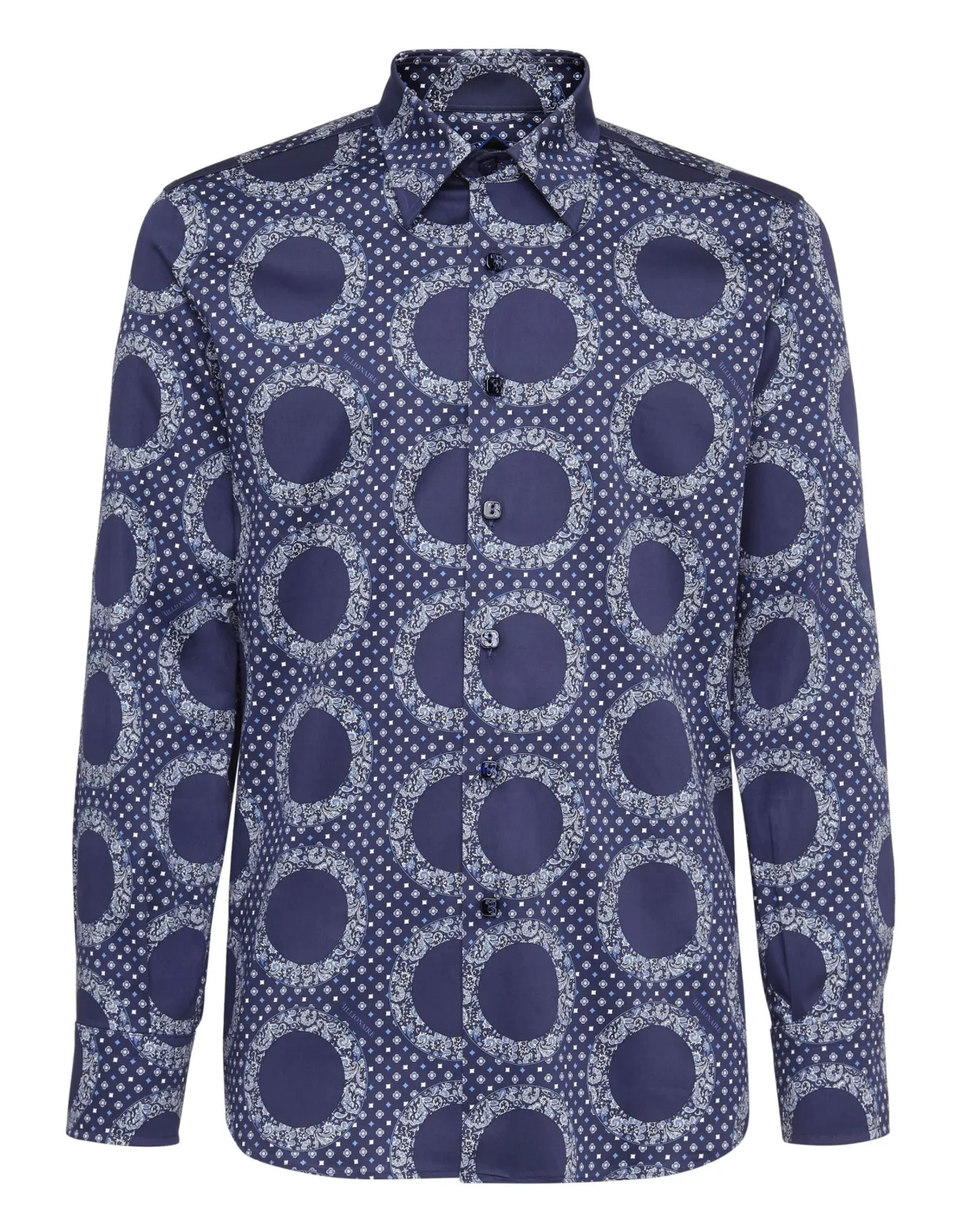 Dit katoenen overhemd met paisleyprint in popeline past perfect bij zowel een jasje als een jeans. Kleine bladkraag, model: Milano. Twee vierkante parelmoeren knopen met logo op de manchetten. Pasvorm: Zilver/Slim.