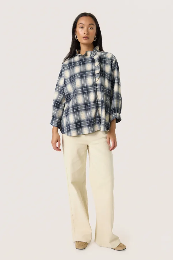 Geruite blouse met los silhouet, gerafelde opstaande kraag en knoopsluiting. Driekwartsmouwen en zacht geborstelde uitstraling maken het af.