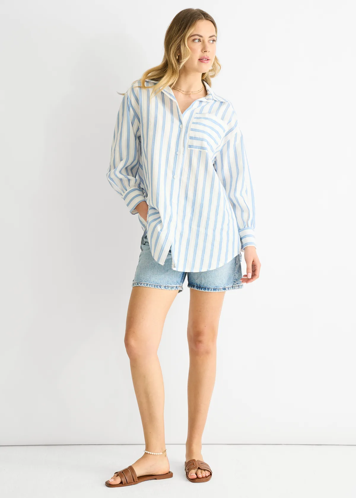 Casual zelfvertrouwen in katoen. Dit oversized shirt straalt moeiteloze coolheid uit met zijn kenmerkende blauwe streep, ruim gesneden voor echt comfort en eindeloze stylingmogelijkheden. De ademende katoenen stof voelt zacht aan op de huid en wordt steeds beter naarmate je het draagt, waardoor het een kledingstuk is dat mettertijd alleen maar beter wordt. Draag het in laagjes, knoop het dicht of draag het open – veelzijdigheid die echt werkt.