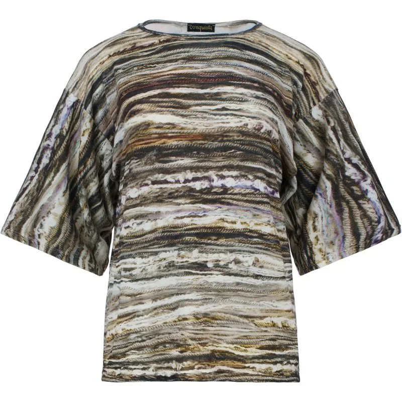 Voeg een vleugje behaaglijke verfijning toe aan je wintergarderobe met dit oversized T-shirt, gemaakt van een zachte en rekbare jerseymix met gebreid effect van 83% viscose, 14% acryl en 3% elastaan. Dit kledingstuk is ontworpen voor zowel warmte als comfort en heeft een opvallende abstracte print in aardetinten, die een unieke artistieke flair aan je look geeft. Het relaxte silhouet, de elleboogmouwen en de ademende maar isolerende stof maken het een ideale keuze voor moeiteloze laagjes. Met een lengte van 65 cm in maat S is deze veelzijdige top prachtig te combineren met een aansluitende broek of denim voor een stijlvolle en toch comfortabele outfit.