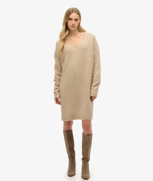Oversized Trui-jurk met V-hals Beige Prijzen