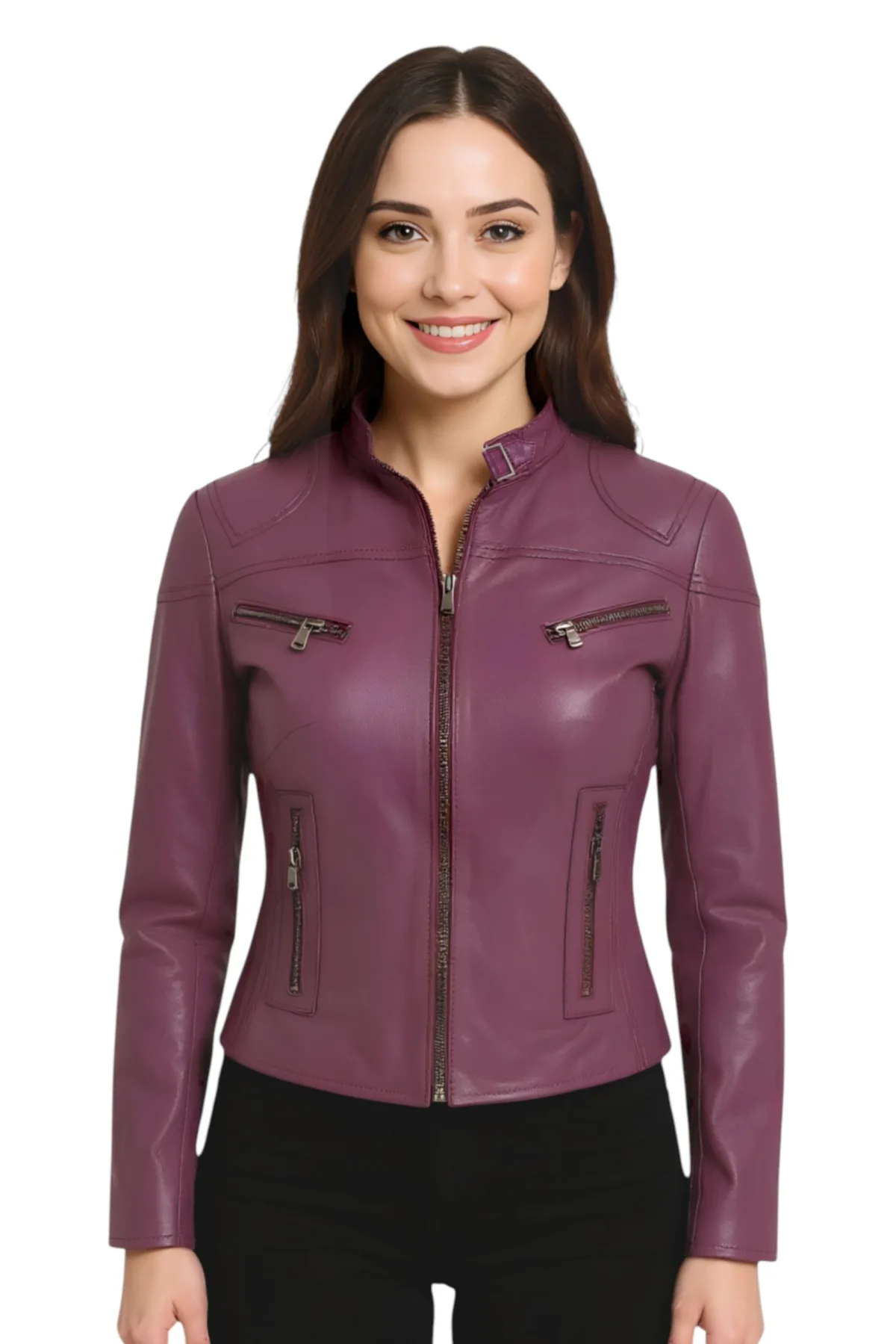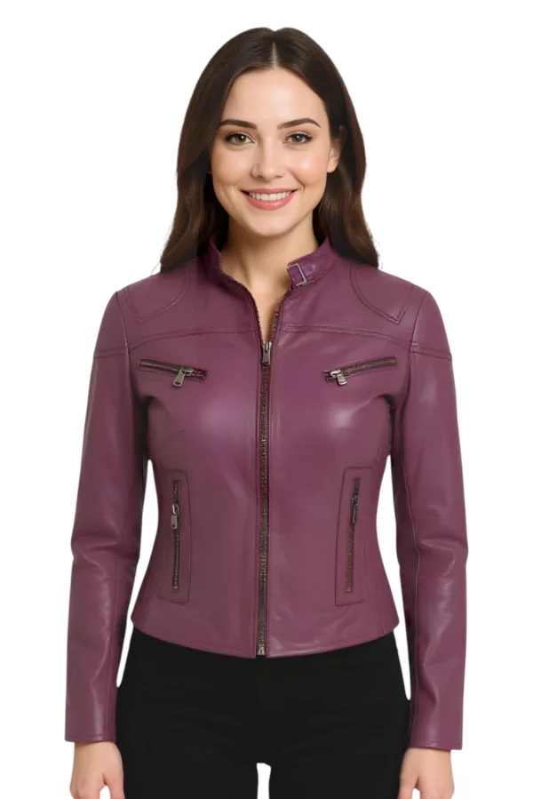 Paarse, casual, slim-fit leren bikerjack voor dames – Tulsa