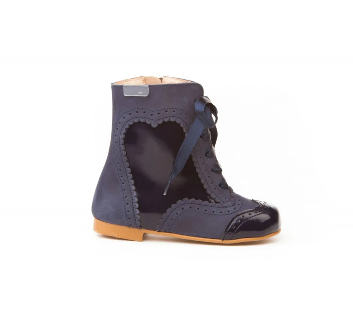 Een klassieke lijn. Comfortabele en zachte paaslaarsachtige schoen gemaakt van nappa-nubuck rundleer en synthetisch lakleer met een vetersluiting met satijnen lint. Het interieur is gemaakt met een voering van natuurlijk leer, teen- en hielbeschermer, binnenzool met anatomische brug en antisliplederen zool. Schoenen ontworpen en vervaardigd in Spanje.
