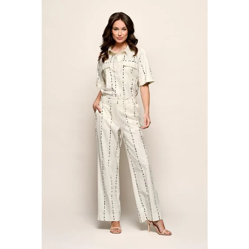 Paige linnen pantalon met speels streepdessin – stijlvol en modernGeef je zomergarderobe een frisse en eigentijdse twist met de Paige printbroek van Mart Visser. Deze variant van de klassieke linnen pantalon valt op door het crèmekleurige linnen met een speels, verticaal streepdessin in zwart, dat doet denken aan subtiele handgeschilderde penseelstreken. Het resultaat is een moderne en artistieke uitstraling, perfect voor een stijlvolle zomerse look. De rechte, losvallende pasvorm geeft de broek een ontspannen elegantie, terwijl de bijpassende strikceintuur in de taille een verfijnde, vrouwelijke touch toevoegt. De lange, rechte broekspijpen zijn afgewerkt met een subtiele ingestreken persvouw, die de benen optisch verlengt en het lijnenspel van het streepdessin benadrukt, waardoor het silhouet flatterend oogt. De Paige linnen pantalon met streepdessin valt normaal qua maat en heeft een soepele, comfortabele pasvorm die geschikt is voor zowel werk als vrije tijd. De hoogwaardige stofmix van 50% linnen, 47% viscose en 3% elastaan combineert het natuurlijke, ademende karakter van linnen met het comfort van stretch. Zo blijft de broek licht, soepel en perfect draagbaar, zelfs op warme zomerdagen.