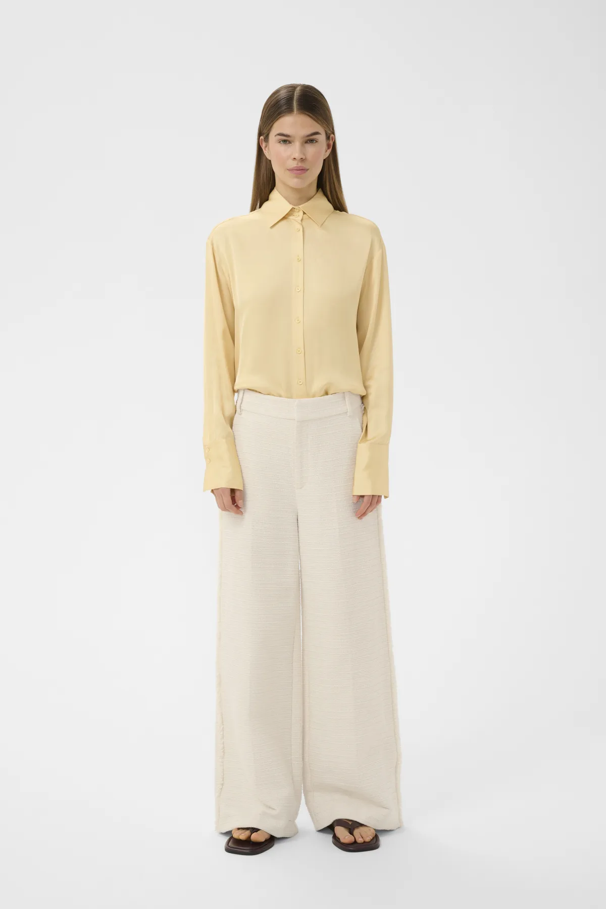 Deze broek heeft een wijde pijp, hoge taille en zichtbare structuur. De volledige lengte en strakke lijnen zorgen voor een moderne uitstraling.