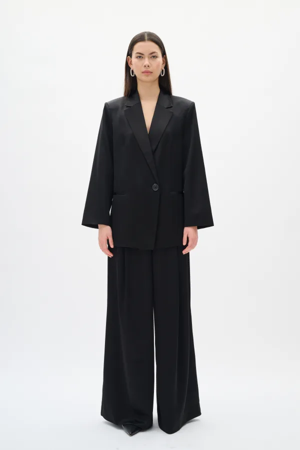 Wide-leg broek met hoge taille, vloeiende uitstraling en rechte tailleband. Extra lange pijpen en zachte glans benadrukken een modern silhouet.