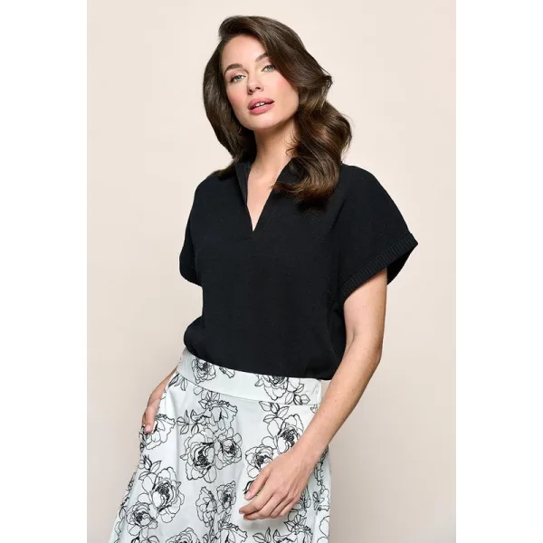 Stijlvolle zwarte gebreide damespolo met tijdloze uitstralingDe Pales polo top in zwart van Mart Visser is een onmisbare zomeressential voor elke garderobe. Deze gebreide damespolo is uitgevoerd in een verfijnde materialenmix van 65% katoen, 23% polyester en 12% nylon, wat resulteert in een licht en hoogwaardig breisel dat ideaal is voor warmere dagen. Het ontwerp combineert de klassieke charme van een polokraag met een moderne, diepe V-hals zonder knopen.De top heeft een comfortabele rechte pasvorm die elegant op de heup valt en moeiteloos meebeweegt met elke gelegenheid. Naast deze krachtige zwarte uitvoering is de Pales polo ook verkrijgbaar in een frisse offwhite variant. De verfijnde details geven dit model zijn unieke karakter. Zo is de top voorzien van aangebreide korte mouwen met een subtiel omgeslagen randje, wat zorgt voor een nonchalante maar verzorgde uitstraling.Zowel de zoom als de mouwuiteinden zijn afgewerkt met brede, stevige ribboorden die extra structuur bieden en ervoor zorgen dat de pasvorm mooi behouden blijft. De diepzwarte kleur versterkt de luxueuze uitstraling van het lichte breisel, waardoor deze polo zowel casual als zakelijk gedragen kan worden.
