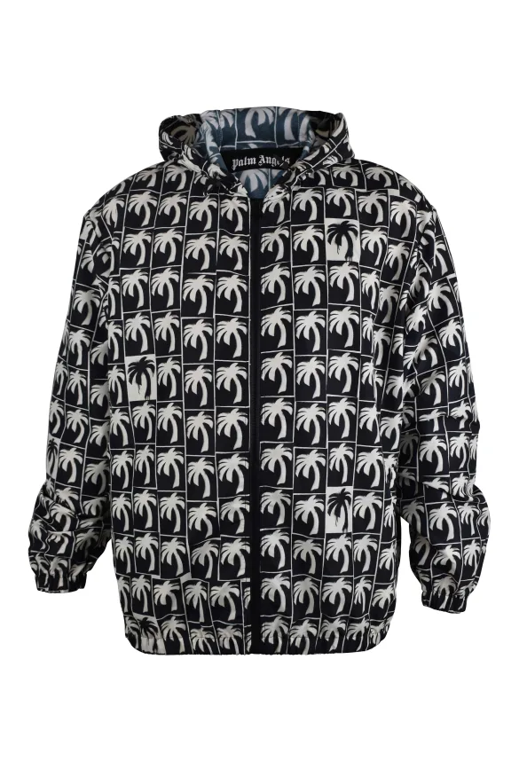 Nylon windjack Palm Angels.Zwarte en witte palmboomprint all over.Capuchon met trekkoord.Ritssluiting.Zijzakken.Elastische taille en mouwen.Made in Italy.