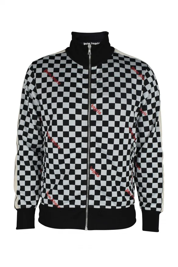 Palm Angels polyester schaakbordvest.Zwart-wit schaakbordprint.Rood logo meermaals bedrukt.Witte en zwarte strepen op de mouwlengte.Ritssluiting.Hoge kraag.Elastische taille.Gemaakt in Italië.