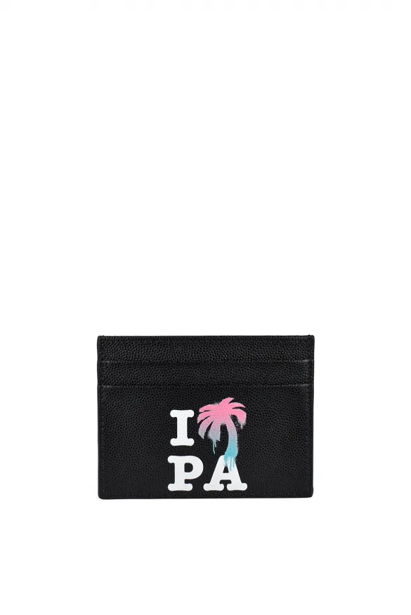 Palm Angels-kaarthouder van zwart generfd leer.Witte print op de voorkant I Love PA .Roze en blauwe grafietpalm op de voorkant.Gleuven voor creditcards en centrale gleuf.100% leer.Gemaakt in Italië.
