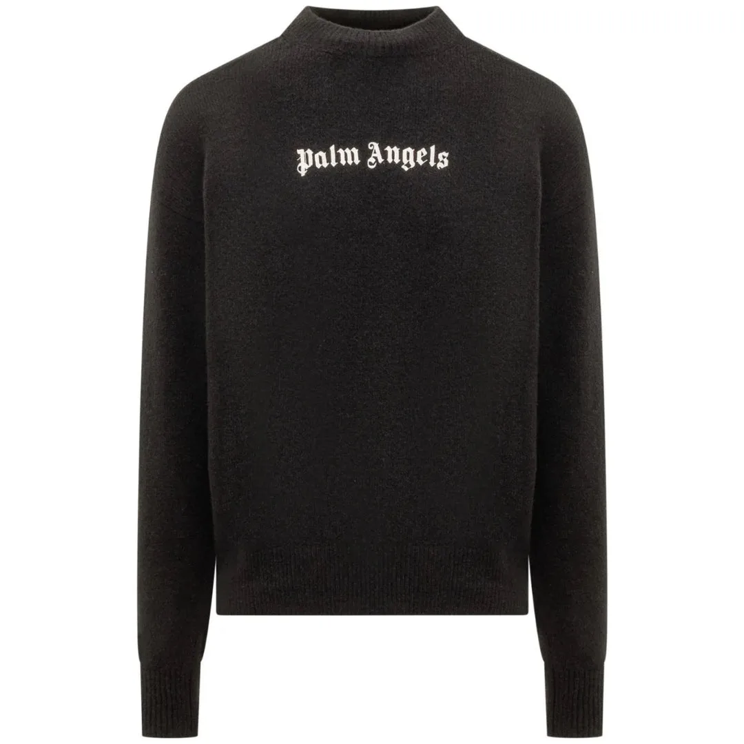Palm Angels klassieke logo zwarte gebreide trui. Ervaar behaaglijk comfort en casual verfijning met de Palm Angels zwarte trui met ronde hals. Deze ultrazachte trui is versierd met een stijlvol logo en is ontworpen om de hele dag warmte en tijdloze stijl te bieden. Maak een statement met deze relaxed-fit trui, perfect voor dagelijks gebruik! Normale pasvorm, zwarte trui. Palm Angels klassiek logo printontwerp, zwarte gebreide trui. 72% merinowol, 20% polyamide, 6% kasjmier, 2% elastaan, gemaakt in Italië, elastische tailleband en mouwuiteinden. Stijlcode: PMHE054F23KNI0041001