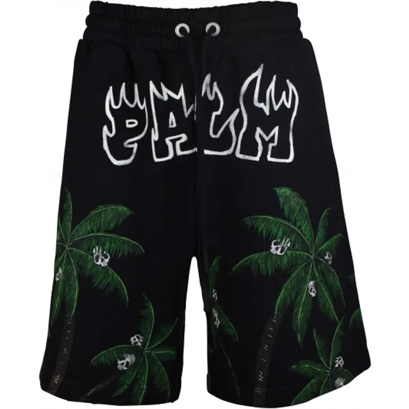 Zwarte katoenen shorts van Palm Angels.Wit vlamlogo gedrukt op de voor- en achterkant.Palmboom- en schedelprints op de voor- en achterkant.Elastische taille met trekkoorden.Zijzakken.Gemaakt in Italië.