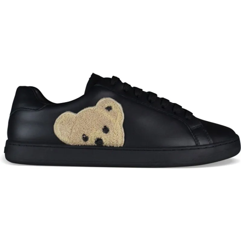 Palm Angels sneakers van zwart leer.Patch bruine teddybeer aan de buitenkant. Zwarte vetersluiting.Rubberen zool.Ronde neus.