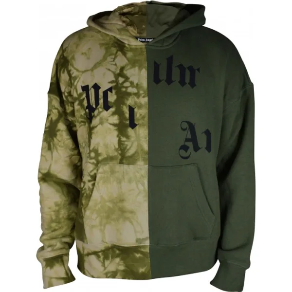 Palm Angels tweekleurig sweatshirt met gebroken logo.Militairgroen tweekleurige tie-dye printontwerp. Palm Angels met gebroken voor- en achterkant.Capuchon.Geribde randen.Kangoeroezak.Lange mouwen.100% katoen.Gemaakt in Italië.