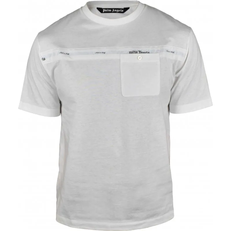 Wit katoenen T-shirt Palm Angels.Borstzak met één knoop aan de voorkant.Witte horizontale streep met zwart logo aan de voorkant.Korte mouwen.Ronde kraag.Gemaakt in Italië.