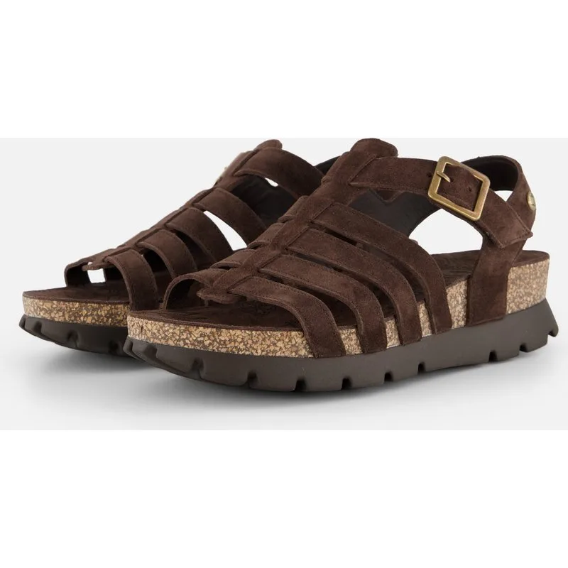 De Panama Jack Sasha sandalen in bruin suede hebben een stoere uitstraling. Het suede bovenwerk met meerdere banden geeft de sandaal een robuuste look. Dankzij de verstelbare gesp sluit de sandaal goed aan om de voet. De leren voering en binnenzool zorgen voor een prettig draaggevoel, terwijl de stevige zool met kurkdetail extra ondersteuning biedt.