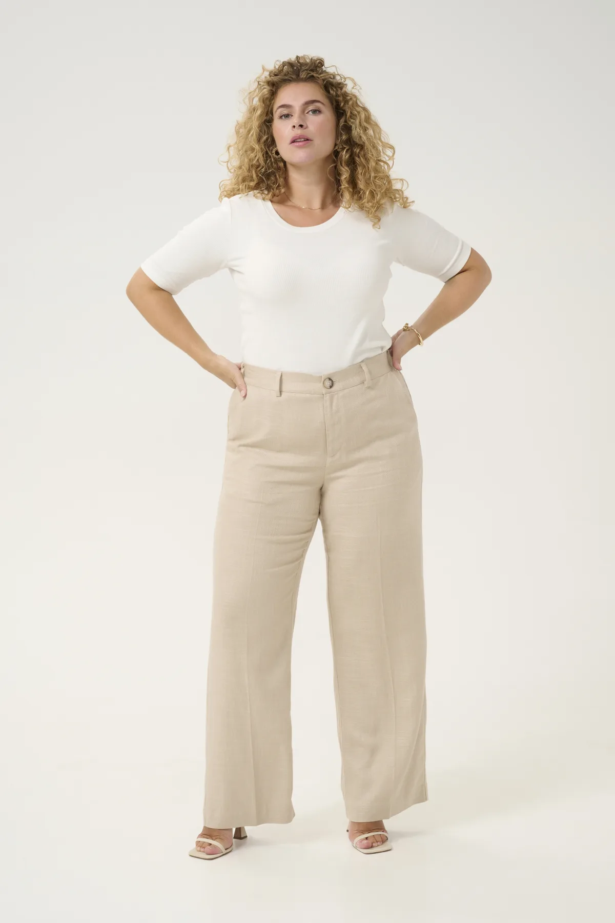 Linnen broek met wijde pijpen biedt een comfortabele en elegante pasvorm. Middelhoge taille, knoopsluiting en riemlussen zorgen voor veelzijdige stylingmomenten.
