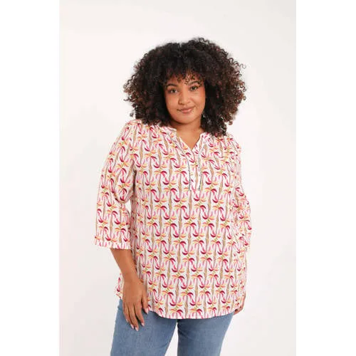 Deze Paprika blousetop met all over print geeft je dagelijkse outfits een frisse, vrouwelijke uitstraling. De top is speciaal ontworpen voor het grote maten assortiment en biedt een comfortabele pasvorm zonder in te leveren op stijl. De luchtige stof met katoen en viscose voelt soepel aan op de huid en beweegt makkelijk met je mee, ideaal voor drukke dagen in het voorjaar.Details die het verschil maken Gemaakt van 60% katoen en 40% viscose, voor een zachte en ademende stof All over print die je look in één keer aankleedt V-hals die het decolleté subtiel accentueert Driekwart mouwen met rechte mouwinzet voor extra bewegingsvrijheid Blousetop model, comfortabel en licht bloezend rondom de heupen Geen zakken voor een gladde, rustige uitstraling Onderdeel van de Daily collectie, perfect voor elke dagGeschikt voor alledaagse momentenDe top past goed bij een smalle jeans of een donkere broek voor naar je werk. Voor een meer relaxte dag combineer je de blousetop eenvoudig met een comfortabele legging. Dankzij de driekwart mouwen is deze top heel geschikt voor de lente of voor binnen, wanneer je geen extra laag nodig hebt.Paprika, speciaal voor grotere matenPaprika richt zich op vrouwen met een grotere maat en een gevoel voor mode. De ontwerpen houden rekening met rondingen, zodat de pasvorm prettig is en de details op de juiste plekken zitten. Met deze top laat Paprika zien dat dagelijkse kleding zowel praktisch als stijlvol kan zijn.Een fijne basis voor je garderobe, waar je het hele seizoen plezier van hebt.