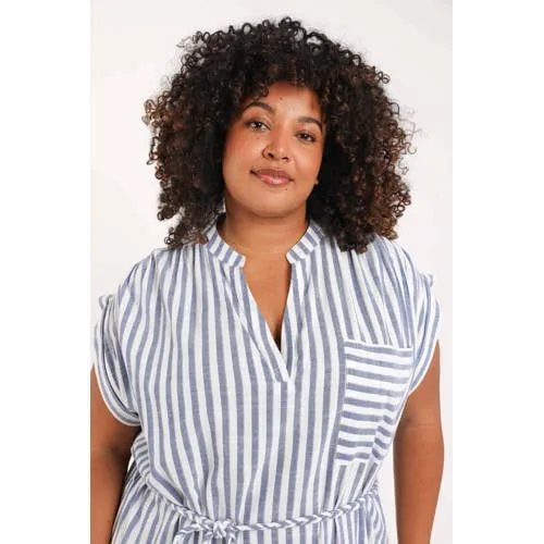 Deze Paprika midi jurk met ceintuur in blauw/ecru geeft je zomergarderobe een frisse update. De jurk heeft een middel-lange lengte en een stijlvolle streepprint in blauw en ecru, waardoor je look direct verzorgd oogt. Door de combinatie van 50% katoen / 50% viscose voelt de stof soepel en luchtig aan, fijn op warmere dagen. De V-hals en korte rechte mouwen zorgen voor een open, zomerse uitstraling, terwijl de ceintuur in de taille subtiel vorm geeft aan je silhouet.Kenmerken van deze gestreepte midi jurk Middel-lange midi jurk, ideaal voor dagelijkse outfits in de zomer Streepprint in blauw/ecru voor een rustige, tijdloze look Gemaakt van 50% katoen / 50% viscose, met een zachte en luchtige touch V-hals en korte mouwen met rechte snit voor een comfortabele pasvorm Ceintuur in de taille voor extra vorm en variatie in styling Geen sluiting, zodat je de jurk eenvoudig aantrekt Onderdeel van de Boutique collectie in grote matenComfortabele jurk voor zomerse dagenDeze midi jurk is geschikt voor allerlei momenten, van een werkdag tot een ontspannen middag op een terras. De soepele stof beweegt makkelijk met je mee en de lengte tot rond de knie biedt comfortabele bedekking. Met de ceintuur kun je spelen met de taille, losjes geknoopt voor een relaxte look of strakker voor meer accent.Grote maten mode van PaprikaPaprika ontwerpt mode in grote maten met aandacht voor pasvorm, draagcomfort en doordachte details. De collecties zijn gemaakt om goed aan te sluiten op het lichaam, zodat je je vrij kunt bewegen en je outfit de hele dag prettig blijft zitten. Met deze jurk haal je een doordacht ontworpen item in huis dat past binnen een moderne, veelzijdige garderobe.Een luchtige, gestreepte midi jurk waar je in de zomer vaak naar zult grijpen.