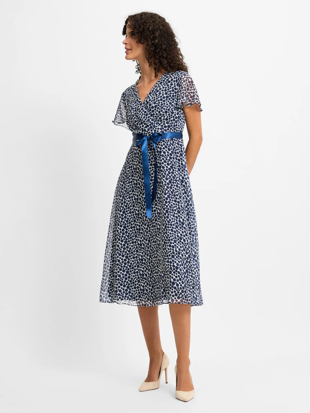 Design: Met riem; Halstype: V-hals; Motief: Gestippeld; Details: Wikkel design; Extra's: All-over patroon, Oplichtende stof; Lengte: Knielengte; Pasvorm: Normale pasvorm; Armlengte: Kwartmouw